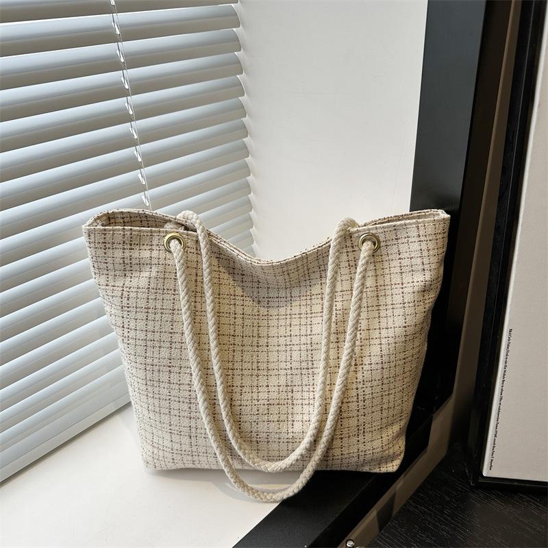 Plaid woven tote bag women's 2025 new high-value commuter art students class handheld cloth bag tide