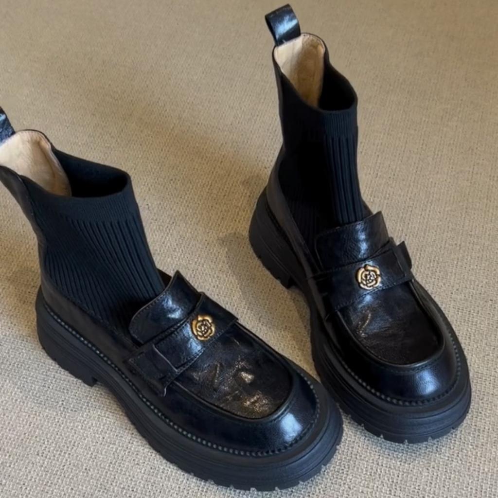 Camellia gestrickte elastische bequeme Damenstiefeletten mit dickem Absatz im Retro-Stil mit dicker Sohle, britische kurze Sockenstiefel, warmhaltend