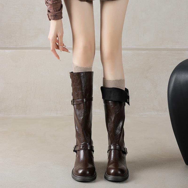 Herbst- und Winter-Dicksohlen-Rutschfeste Damen-Komfort-Lederstiefel mit niedrigem Absatz, Übergröße, Damenstiefel mit Blockabsatz und runder Spitze, kn