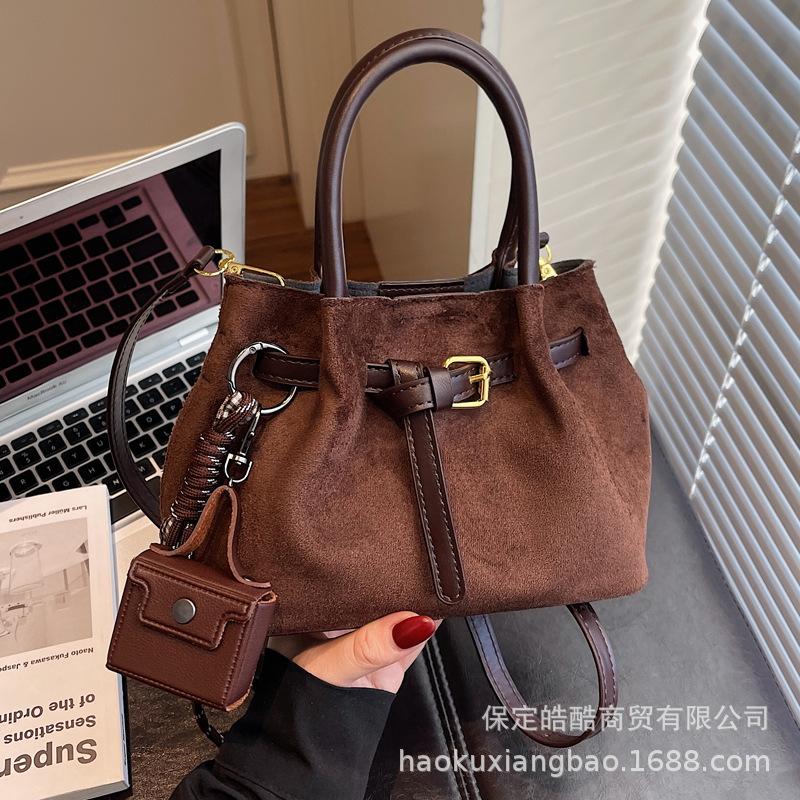 Suede bag women's autumn and winter 2025 new niche design retro shoulder messenger bag pleated portable bucket bag