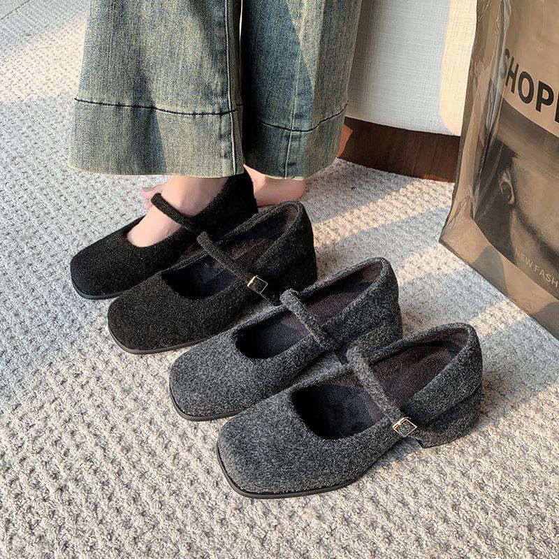 Pendler dicke Absätze hohe Absätze französische Wollschuhe 2025 Mary Jane Einzelne Schuhe eckige Spitze grau Flaum kleiner Duft Damen neue Modelle