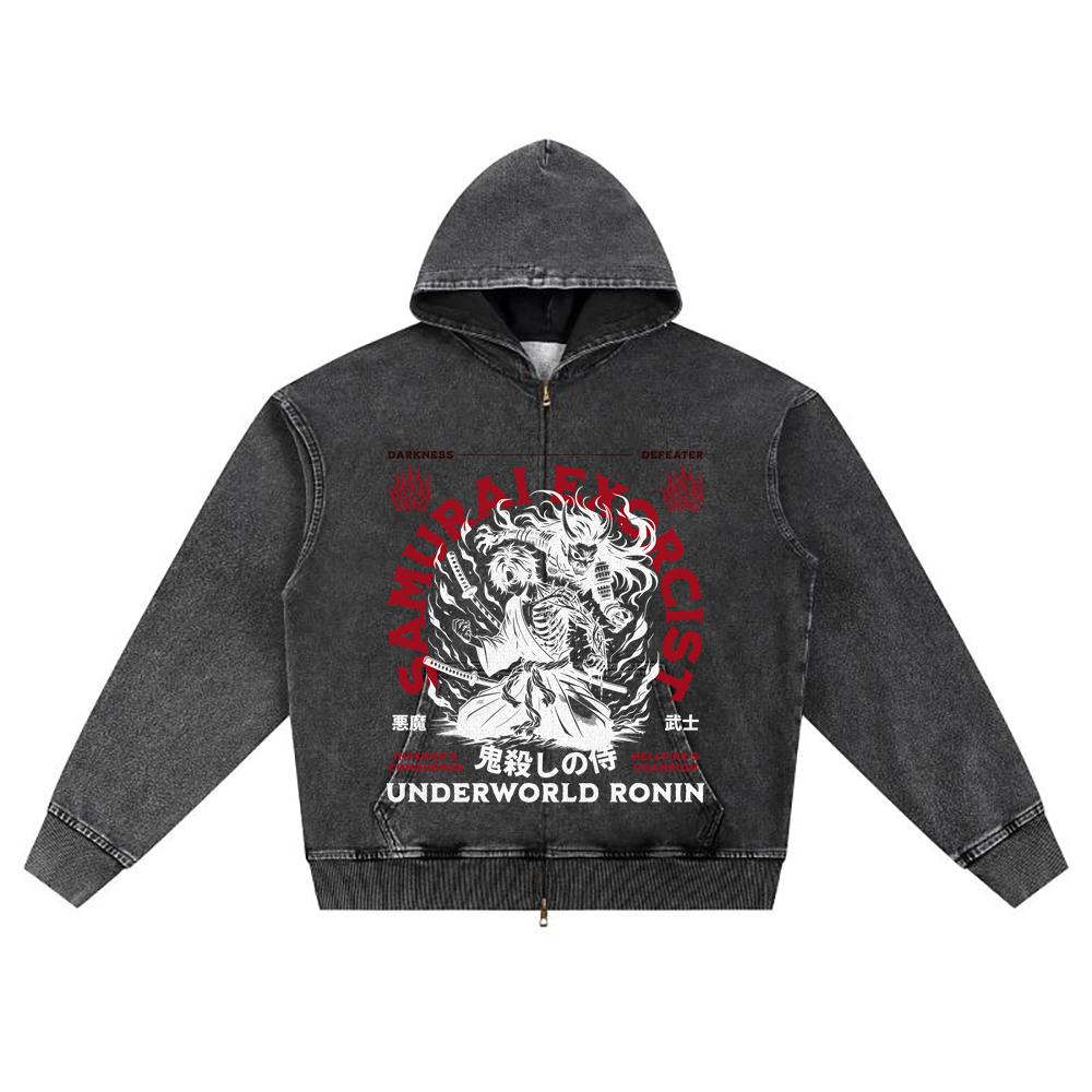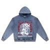 DTG-Druck Gestrickter Denim Zip-Up Hoodie Japan Samurai Bruder Druck Reißverschluss Hoodies