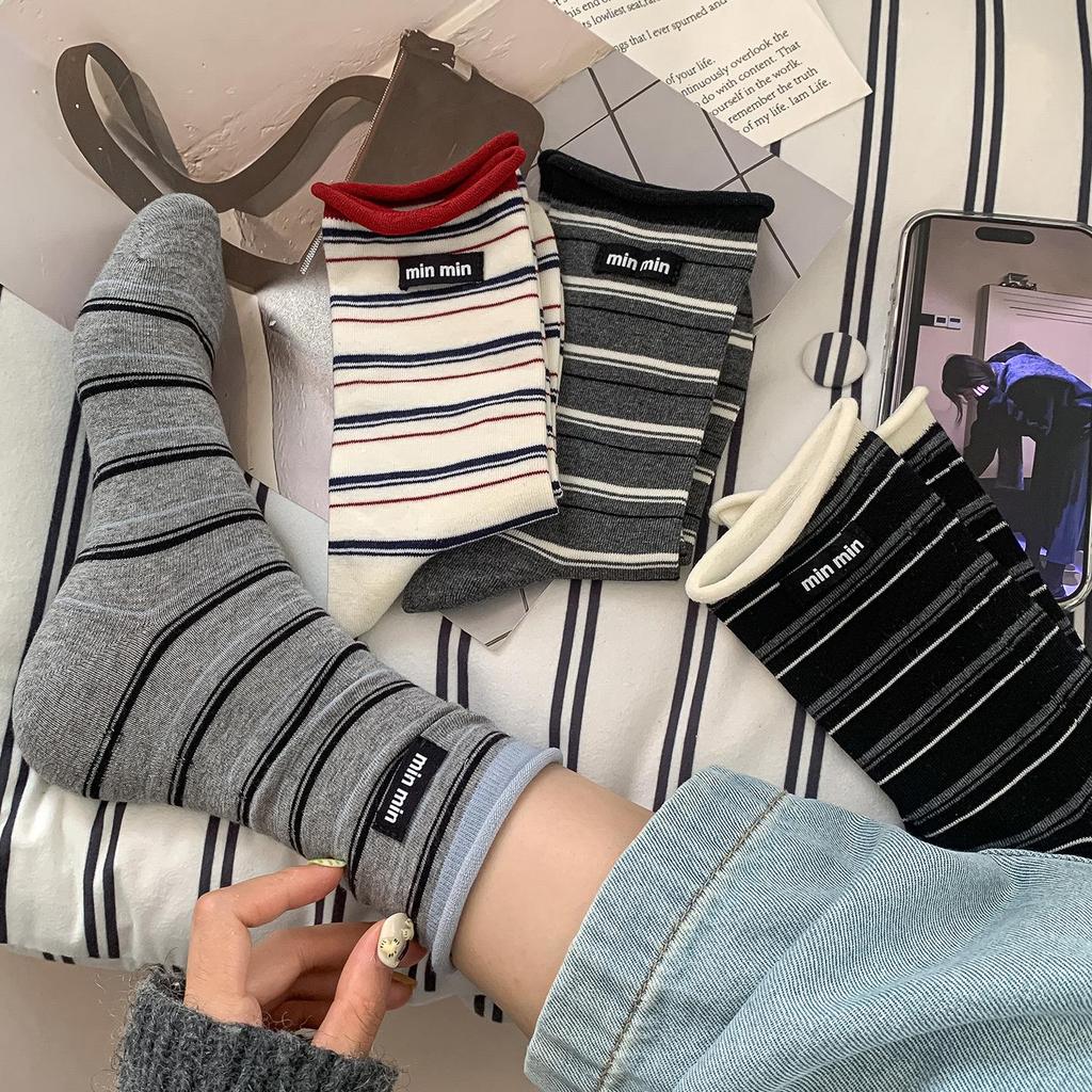 Baumwollsocken für Damen im koreanischen Stil mit Streifen und Rollrand - Herbst/Winter Mid-Tube, Academy Wind Miu Serie, mit Stoffetikett.