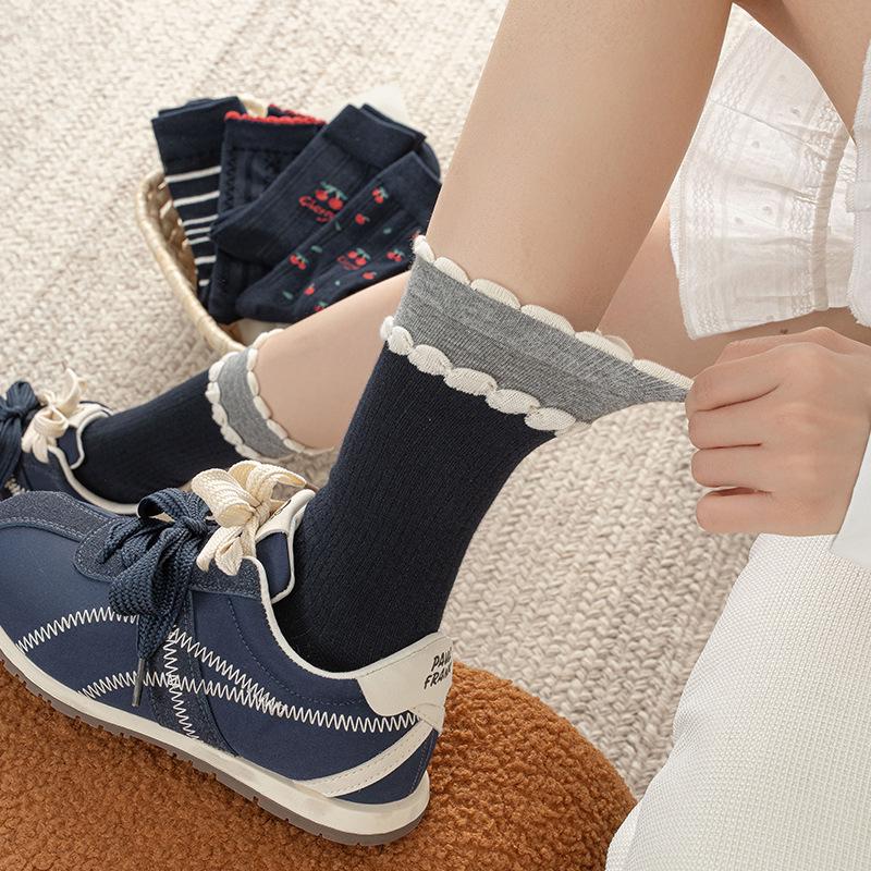 Damen Retro Kirsche gekämmte Baumwolle Mid-Calf Socken mit gestreifter Spitzenrüsche - Herbst/Winter Japanischer Stil.