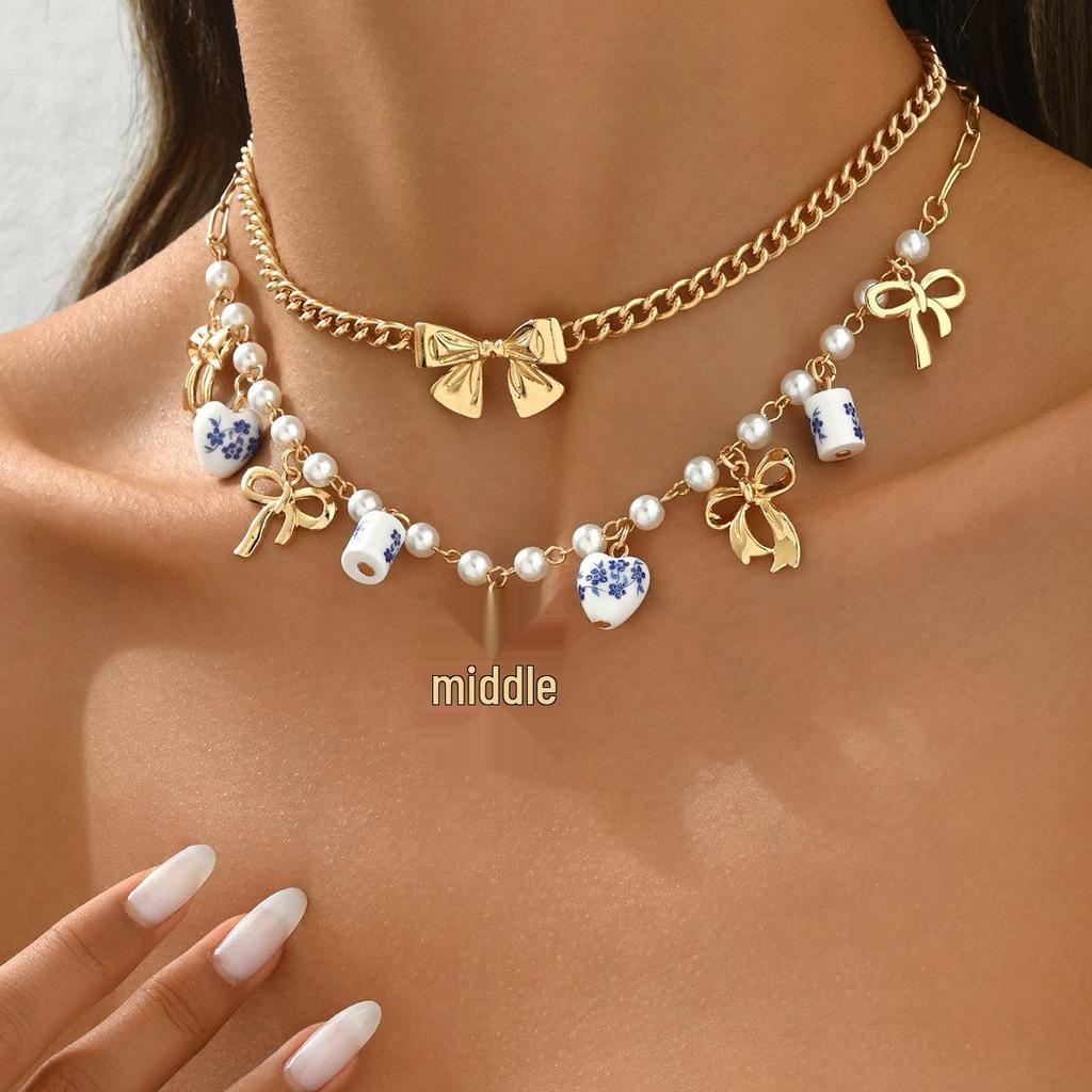 Doppellagige Perlen-Schleifen-Anhänger-Halskette - Modische Keramik-Schlüsselbeinkette