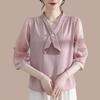 Chiffonbluse Damen Langärmlig Schwarz Ohren Stehkragen Floral Top