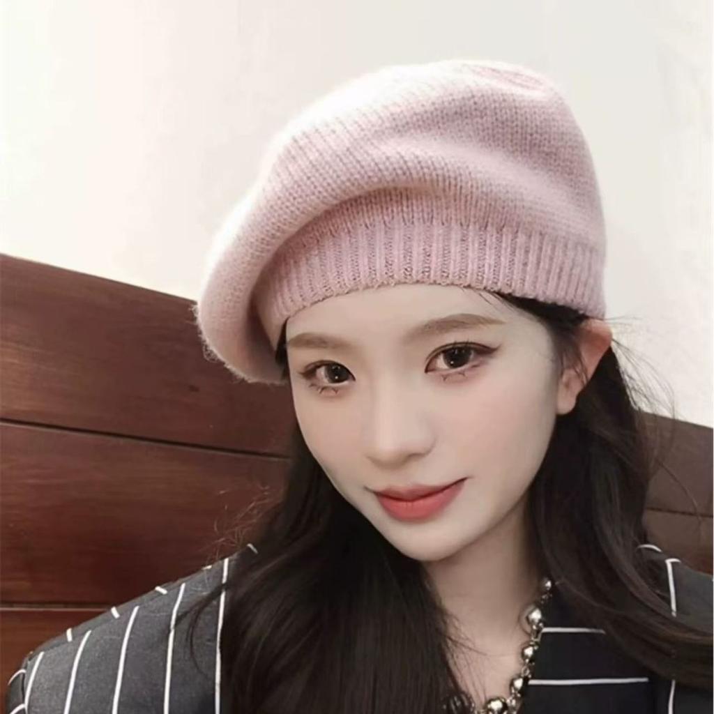 Matcha Grün Kaninchenfell Baskenmütze für Damen Herbst und Winter Literarische Retro Malermütze Vielseitige Mode Strickmütze Wollmütze