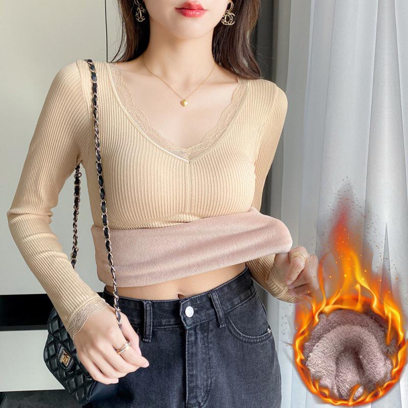 Warmer Damen V-Ausschnitt Spitzen-Patchwork Thermo-Top mit Brustpolstern, Fleecegefütterte Langarm-Basisschicht für Winter und Herbst.