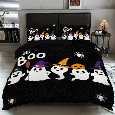 3-teiliges Halloween-Motiv Kürbis, Geist, Burg, 1 Federmäppchen + 2 Kissenbezüge, ohne Füllung, weiches und bequemes Bettwäsche-Set