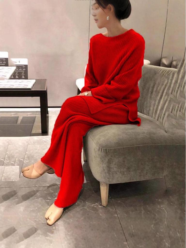 2025 Damen Herbst/Winter Langarm Einfarbig Gestrickt Lässig Zweiteiliges Set