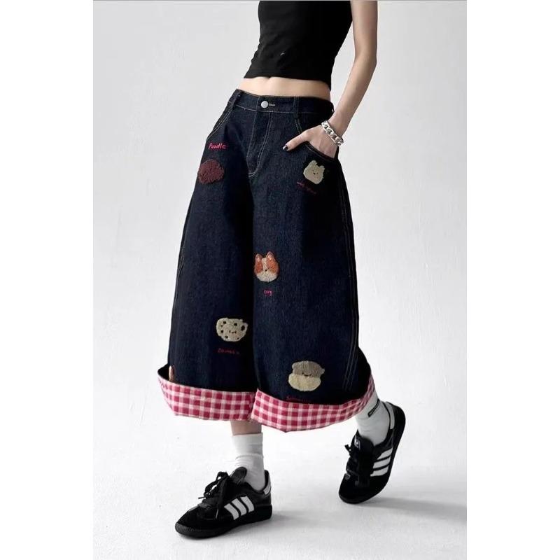 Gewaschene Distressed Welpenbestickte Weitbein-Denimshorts für Damen 2025 Sommer Retro Locker Schlankmachende Cropped-Hose