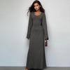 Europäisches und amerikanisches Damen 2023 Herbst U-Ausschnitt Rückenbindung Langarmkleid