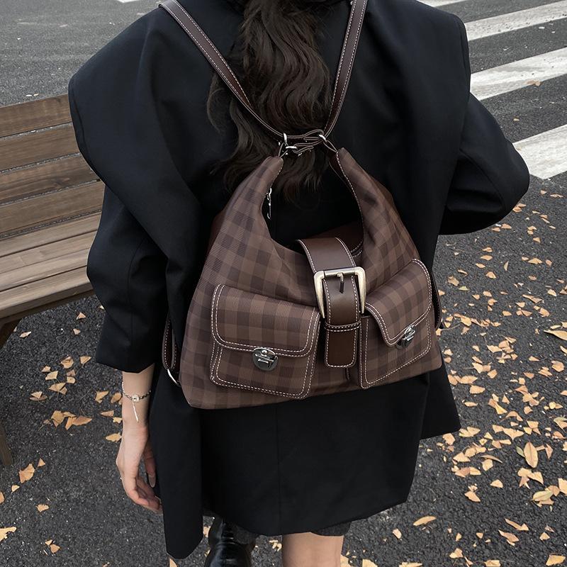 Retro large-capacity shoulder bag women's 2025 new plaid tote bag multi-functional backpack leisure bag