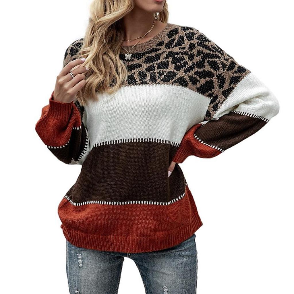 J-Scott Women's Leopard Print Knit Sweater with Striped Print, Crew Neck, Drop Shoulder, Long Sleeves, Feminine Casual Loose Fit, Red (JS178-RD-M)