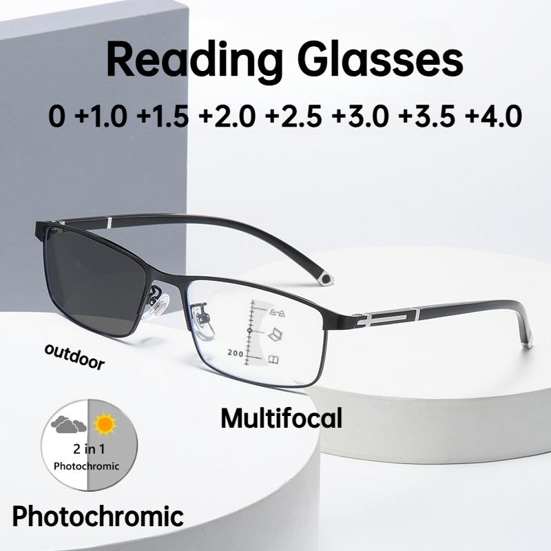 Men'S Classic Square Full Frame Photochromic Multifocal Reading Glasses Anti-Blue Light Far And Near Presbyopia Glasses