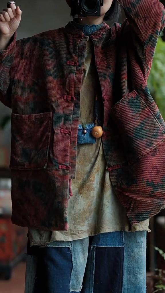 Johnature Women Vintage Corduroy Print Floral Button Patchwork Pockets Winter Coats Warm Coats