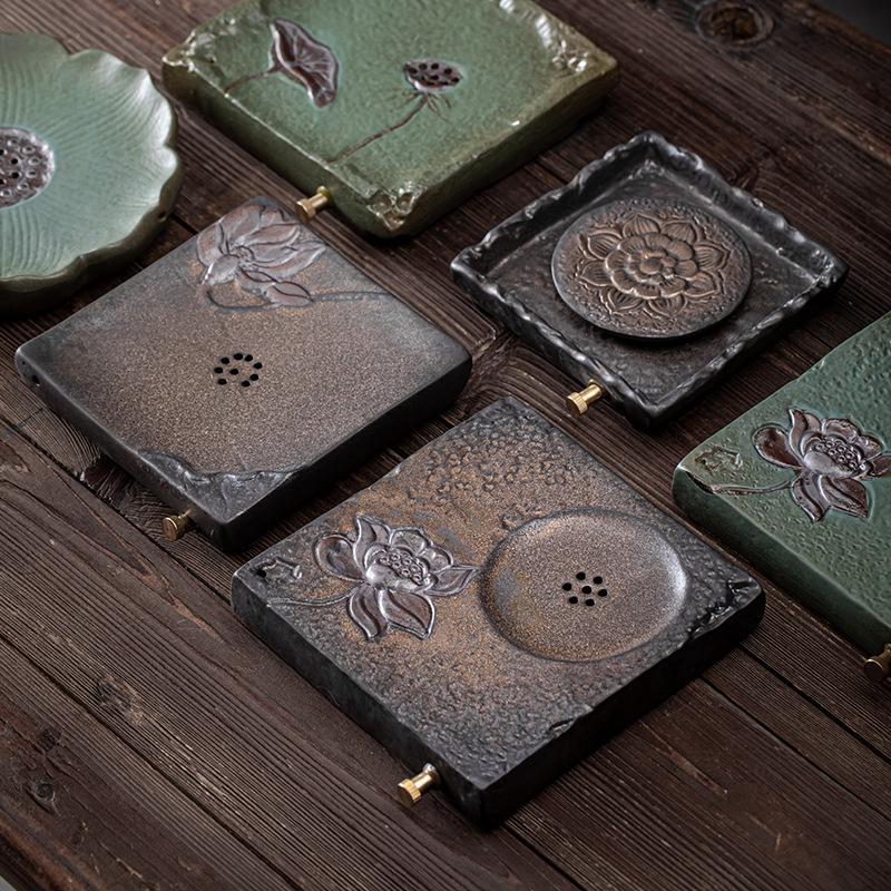 Teeablage Keramik Tee Serviertablett mit Abtropffläche Retro Lotusmuster Untersetzer Teetisch Box mit Wasserspeicher für Kungfu Set