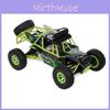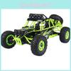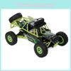 This 1:12 scale remote-controlled climbing off-road vehicle features a durable plastic construction designed for rugged outdoor use. It supports wireless remote operation through a handheld controller, enabling precise maneuvering and climbing. Its bright green color makes it highly visible during play.