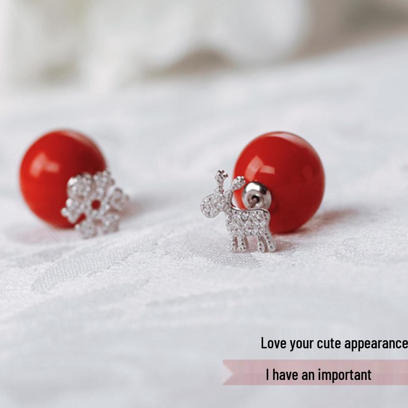 Christmas Reindeer Snowflake Red Pearl 925 Sterling Silver Stud Earrings