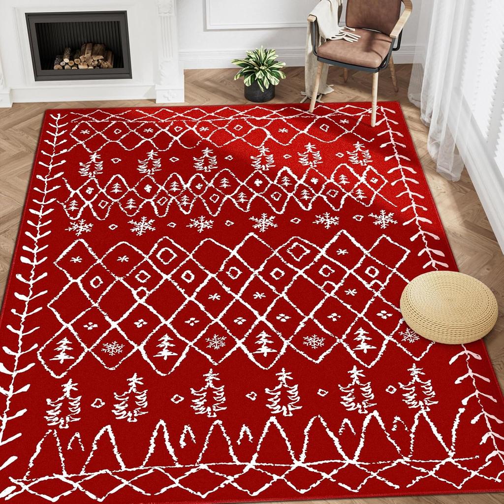 Weihnachts-Bereichsteppich Rot Schneeflocke Wohnzimmer Schlafzimmer Teppich Waschbarer Rutschfester Teppich für Küche Eingangsbereich Matte Badezimmer Heimdeko