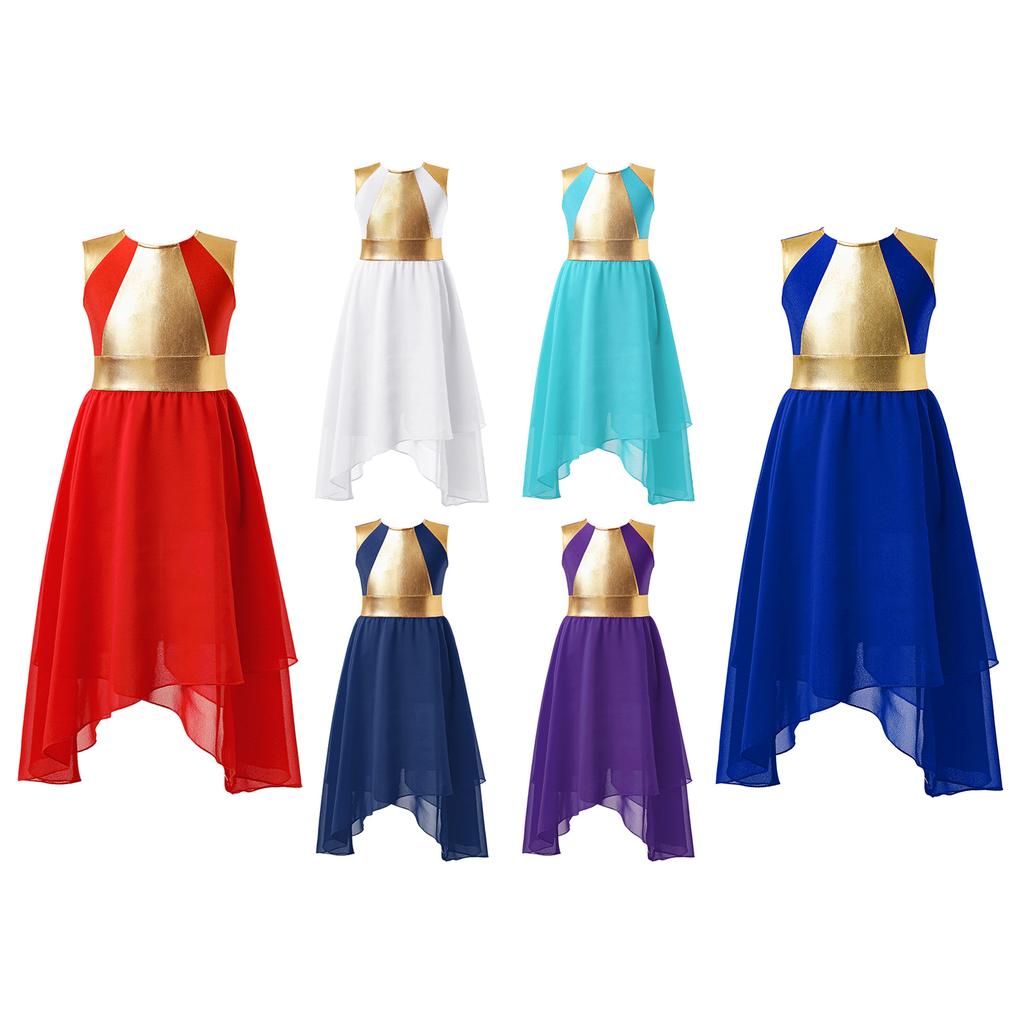 Asymmetrisches, lyrisches, zeitgenössisches Tanzkleid für Kinder mit Farbblockmuster, ärmellose Praise-Tanztunika