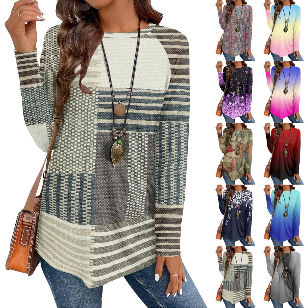 Damen Casual Übergröße Langärmlig Rundhals Vintage Ethnischer Druck T-Shirt Top Pullover