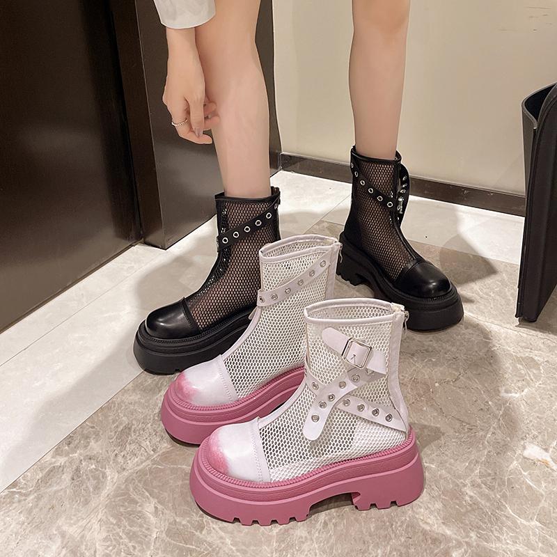 Mode Blockabsatz Kühlstiefel Herbst Neu Runde Zehenpartie Paneled Mesh Nieten Schnalle Reißverschluss hinten Plateau Kurze Stiefel