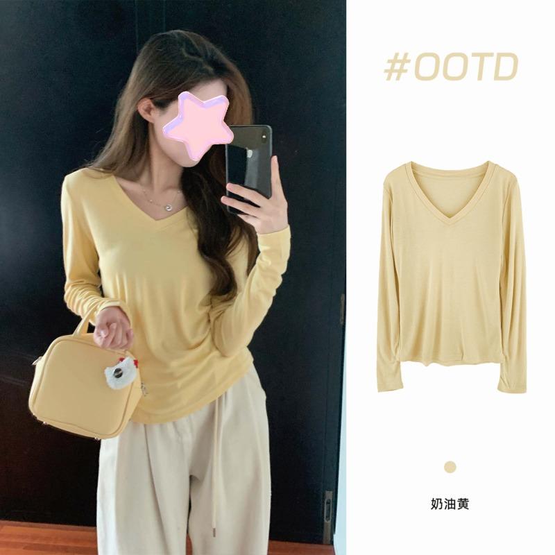 Neck bright yellow thin long-sleeved shirt women's bottoming shirt autumn slim fit pure desire style thin inner basic top