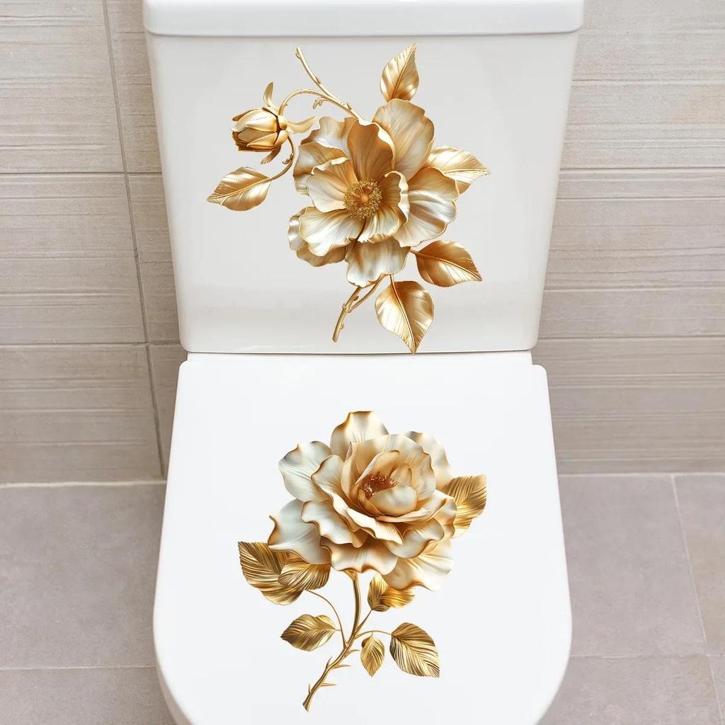 2 Blatt Schöner Goldener Blume Toilettenaufkleber Badezimmer Toilettendeckel Dekorativer Aufkleber Wasserdicht Selbstklebend