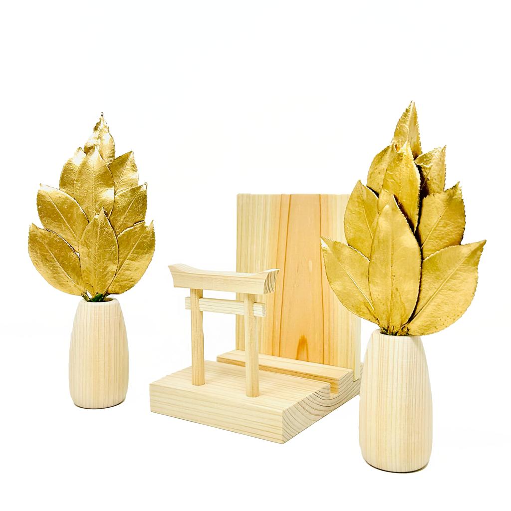 These sakaki trees are made from domestically grown camellia leaves that have been preserved and dyed gold, allowing for long-term use (approximately one year or more) without the need for replacement. A unique manufacturing process (Utility Model No. 3222297) prevents them from losing their shape. This set includes a pair. The round sakaki stand and Shinto altar are both made from domestically grown cypress.