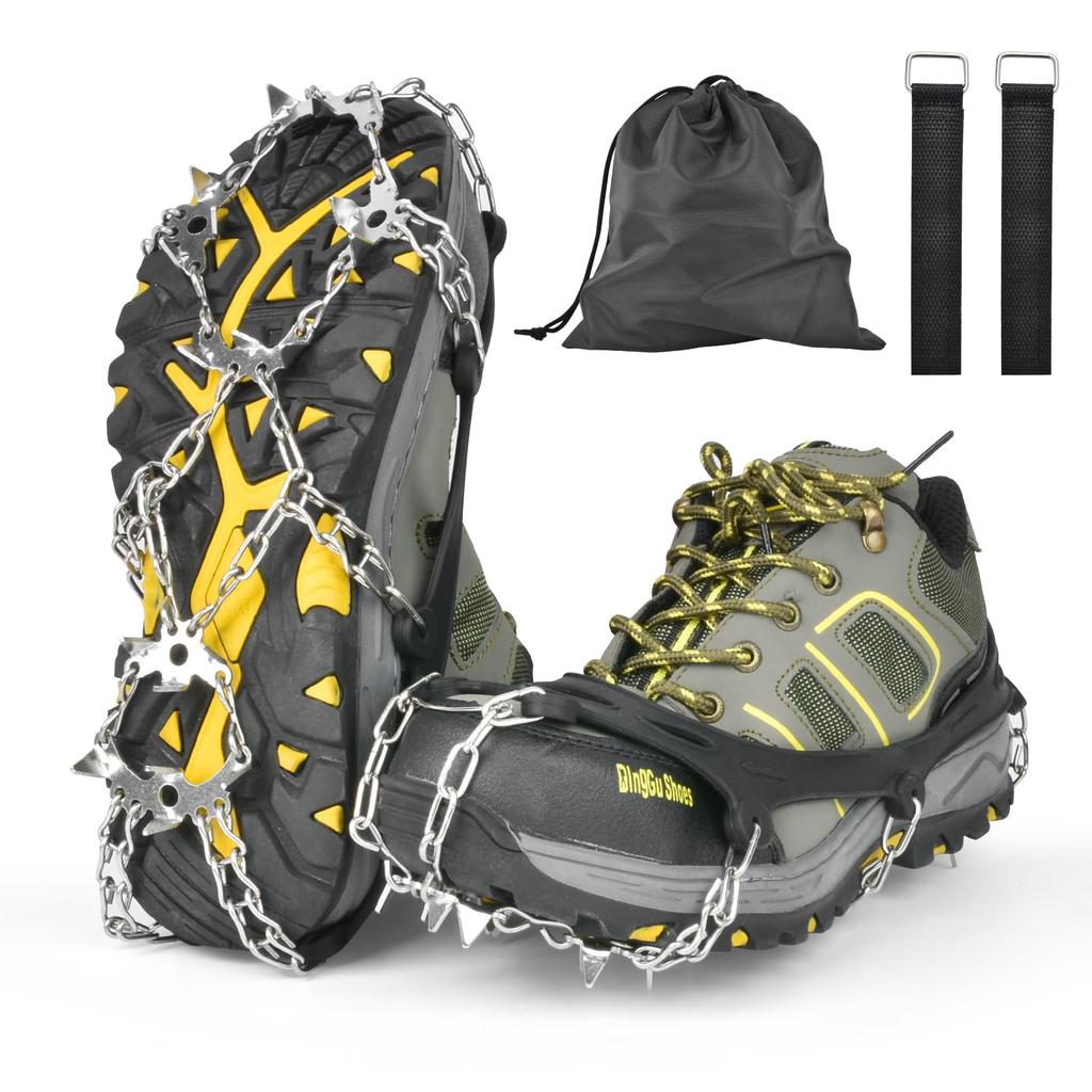 KIMINO Steigeisen sind Kettensteigeisen mit 19 Spikes. Die Spikes aus Edelstahl 201 greifen fest auf Eis und Schnee und sorgen für einen stabilen Gang auch auf eisigen und verschneiten Straßen.. Je weniger Spikes, desto leichter und einfacher zu gehen, was sie ideal für den täglichen Gebrauch und leichte Bergwanderungen macht.. Das hochelastische Silikonband und zwei verstellbare Riemen ermöglichen eine sichere Befestigung an Wanderschuhen, Arbeitsschuhen und mehr. Die mitgelieferte Aufbewahrungstasche macht sie leicht zu tragen, wodurch sie ideal für eine Vielzahl von Anlässen sind, einschließlich Winterpendeln, Eisangeln und Wandern.
