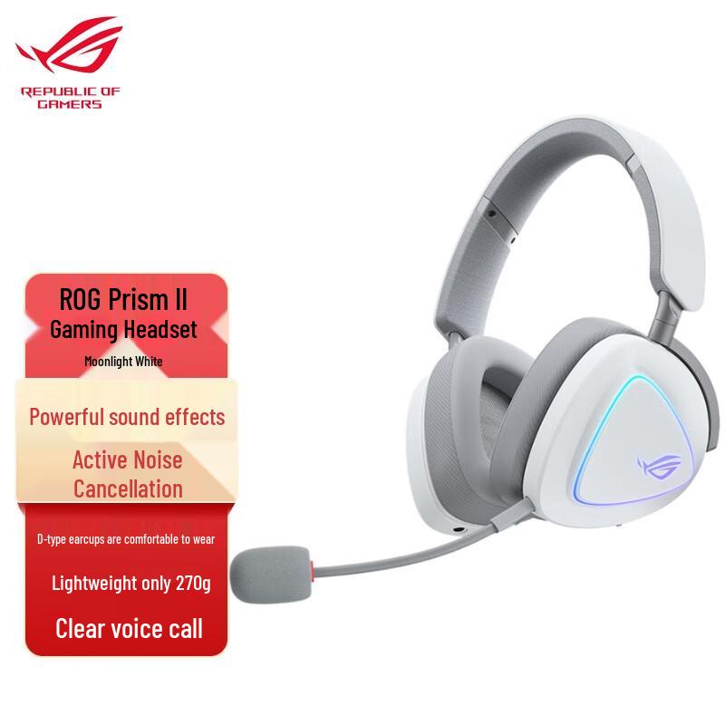 Immerse yourself in gaming with the ROG Prism 2 Tri-Mode Wireless Gaming Headset. This over-ear headset boasts flexible connectivity including Bluetooth 5.2, 2.4GHz wireless, and a 3.5mm jack. Equipped with 50mm titanium-plated drivers, 7.1 simulated surround sound, a detachable microphone, and dynamic RGB lighting, it delivers a powerful audio experience.