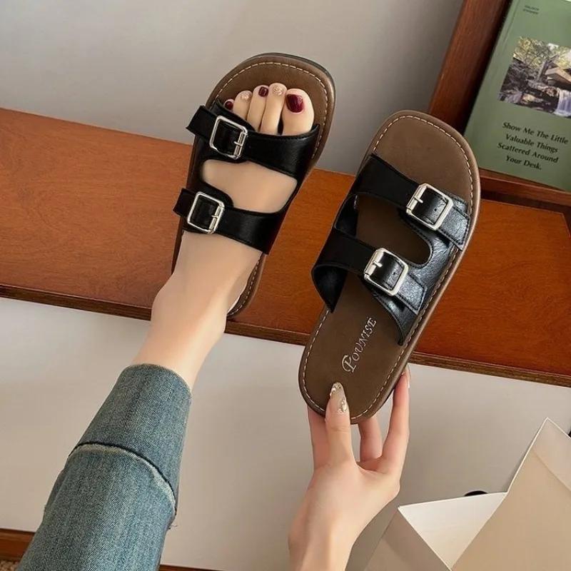 Mode Modische Sandalen mit dickem Absatz Damen Flache Römische Strand-Slipper mit quadratischer Schnalle Cross-Border-Stil Sommer Zehenfreie Slipper