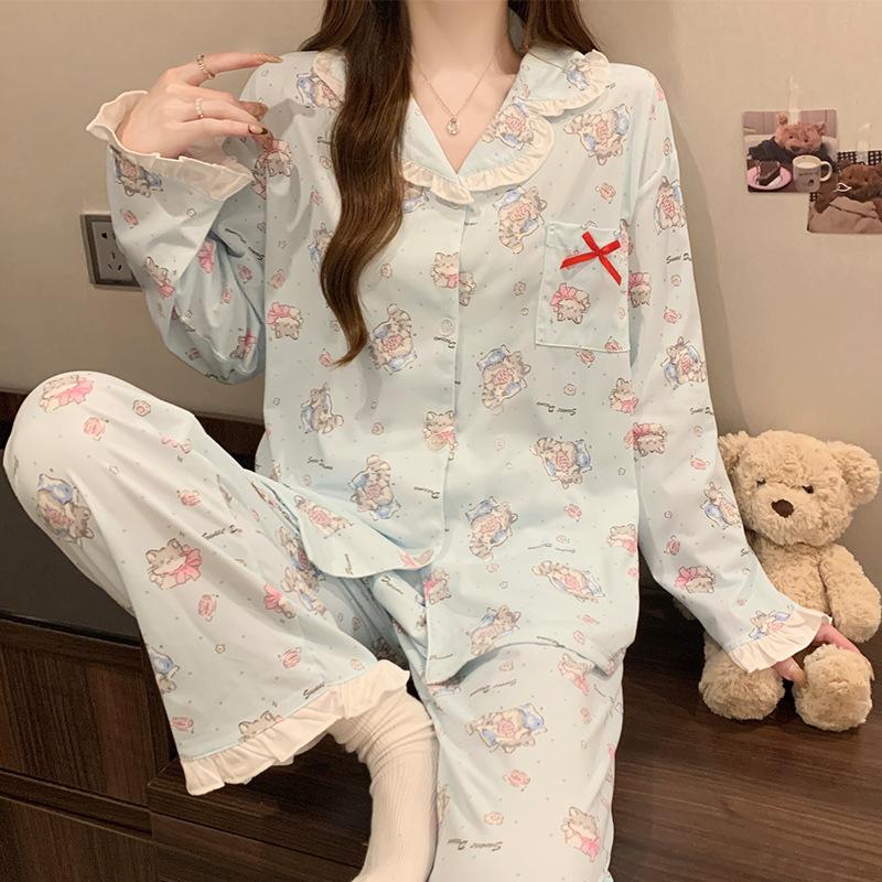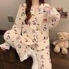 Imitationsbaumwoll-Pyjama Damen Frühling und Herbst Cardigan Langarm Comic-Katze hochwertiges Schleifen-Loungewear-Set