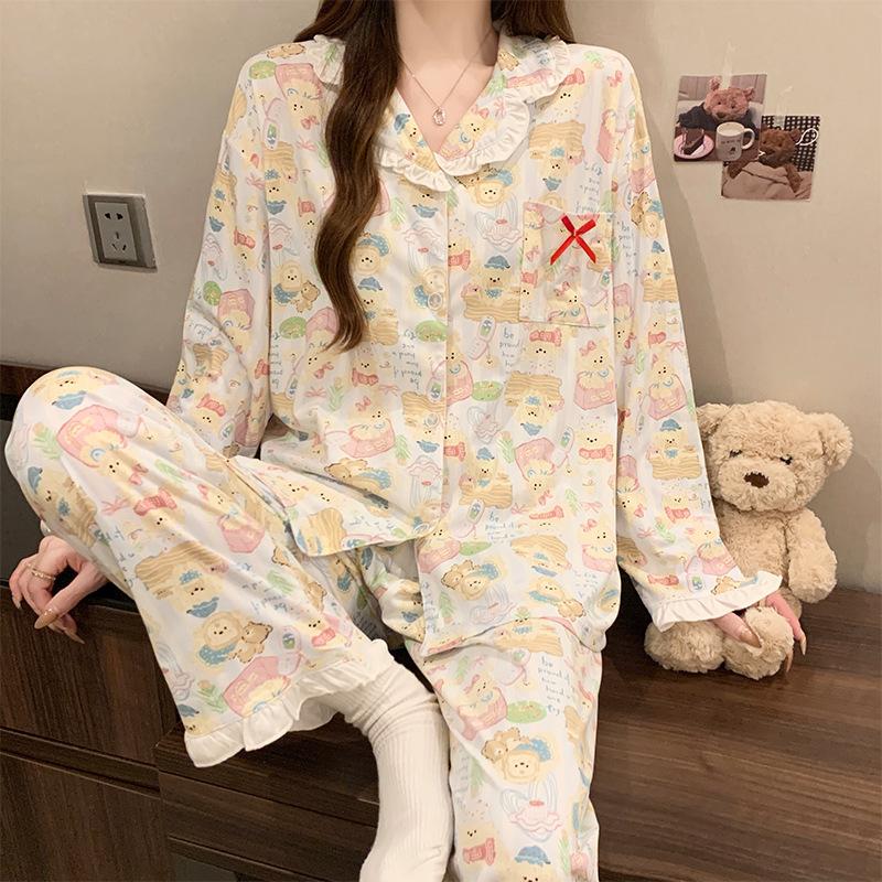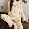 Small fresh women's pajamas spring and autumn sweet lace imitation cotton long-sleeved cartoon bow loungewear set