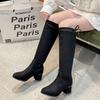 Damen Überweite Schwarze Stretchstiefel, Wildleder Klobiger Absatz Kniehohe Stiefel, Europäischer Streetstyle Stiefeletten für Damen