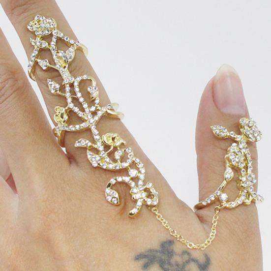 Glänzende Dekorative Doppel-Fingerringe Legierung Voll Strass Rose Blume Kettenglieder Ringe Schmuck Geschenk