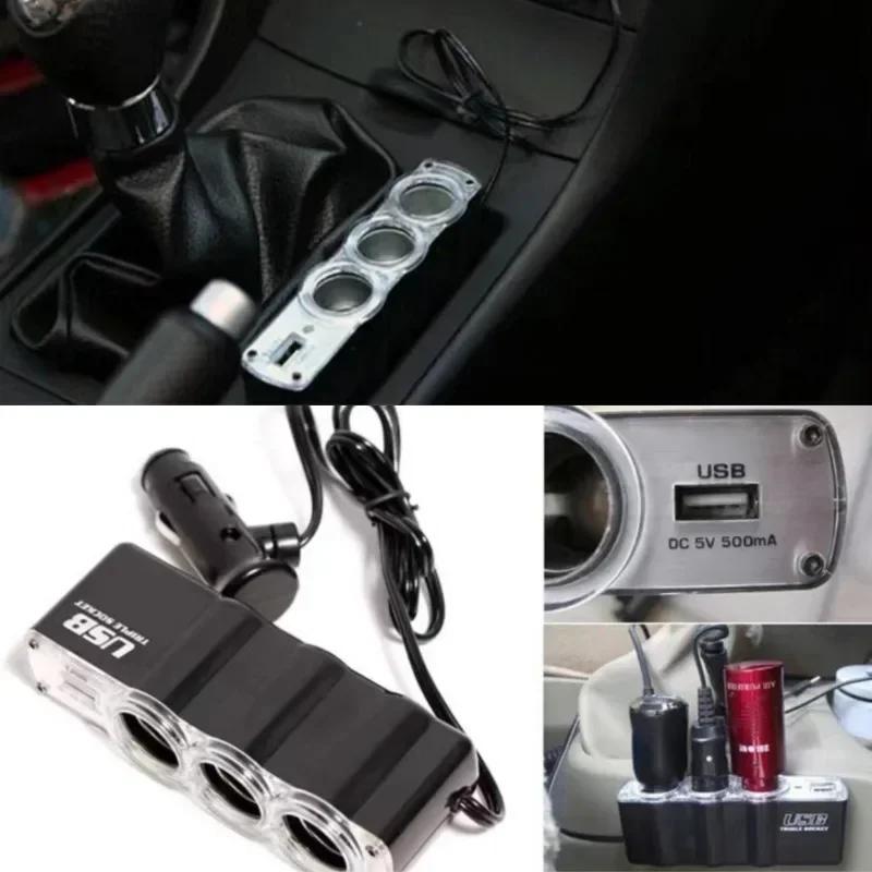 Car Lighter Adapter Charger Adapter Triple Splitter Lighter Output 12V ABS Black Cigar Car Adapter Lighter Multi Socket USB Port