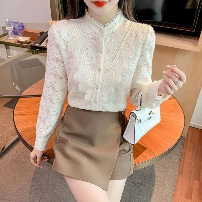 Spitze Damen Herbst und Winter Stehkragen Modisch Langärmliger Knopf-Pullover Elegant Unterzieh-Tops für