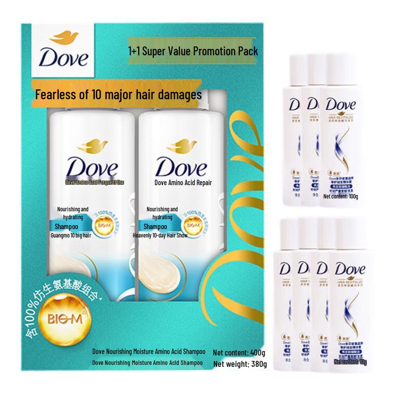 This Dove nourishing and hydrating set is designed for normal hair, providing essential cleansing and anti-dandruff benefits. It leaves hair voluminous, fluffy, clean, and smooth, and is suitable for various scalp types. The set includes a 400g shampoo, a 380g shampoo, and seven 100g serums.
