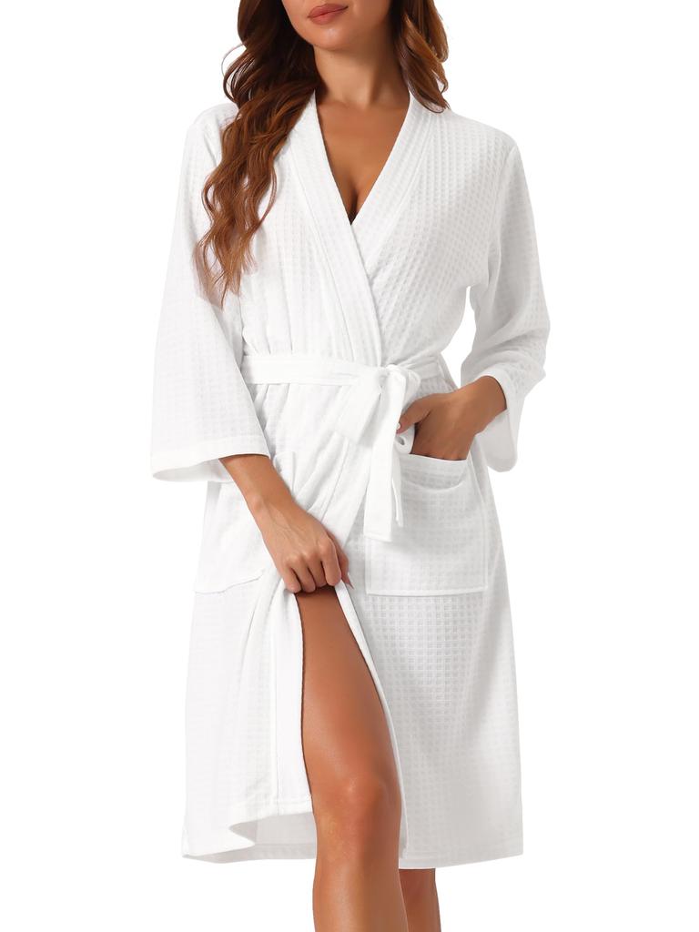 Cheibear Women's Waffle Bathrobe, Soft Kimono, Spa & Bath, Mid-Length, White, Size S