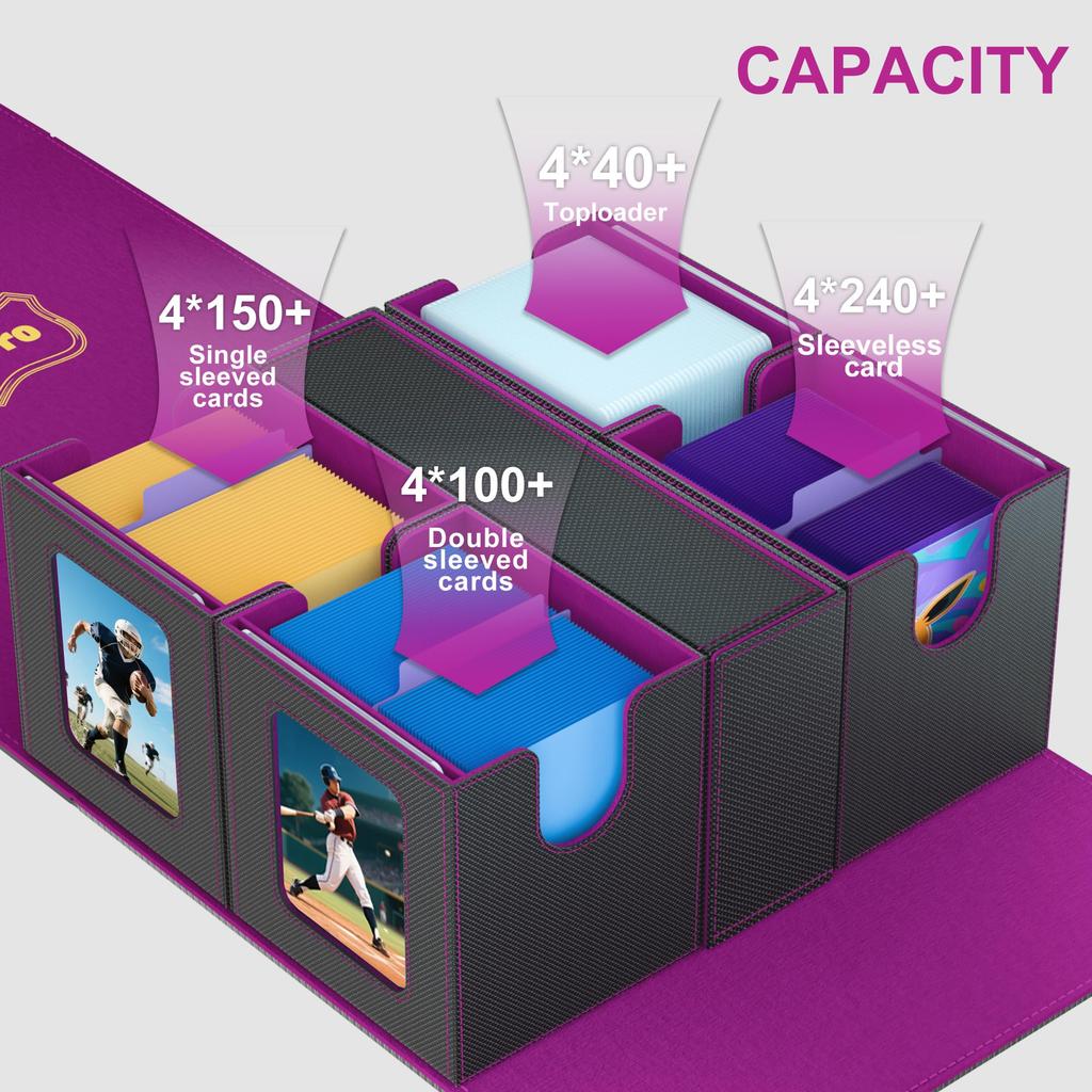Global Patented Design: RyshePro 5 in 1 Deck box Composed of one separated dice box and four card boxes with window, they all equipped with detachable covers, quick and easy access to your cards and accessories.Inclusion: Card storage box includes 4 dividers help you classify your cards more effectively;Equipped with4Toploaders card holders offer an extra protection, extending the life of your card and preserving th card holders offer an extra protection, extending the life of your card andpreserving the brightness of color in long time keeping.Premium Materials: This Removable deck box crafted from premium dustproof, water-resistant PU leather, A soft microfiber lining that protects cards from scratches and wear.Strong Magnetic Closure: Featuring 3 powerful magnets, the Removable deck box ensures a tight seal,keeps the lid closed during transportation,great forkeeping decks safe and organized.Ideal for Card Collectors: RyshePro storage box for trading card is a ideal choice for gamer, suitable for Dragon Shield Sleeves, PTCG, Yugioh, baseball card, sports card; Enjoy card games with your friends or family with this carefully crafted card box.Excellent Service: We are more than happy to provide you with high quality . If you have any questions, please feel free to contact us at any time.Feature:Game Card box detailsProduct name: 5in1 deck box [Product size]:20.9*20.9*12cm /8.23x8.23x4.72inchProduct Specification: single row large capacity,5in1,waterproof,storageNet weight: 1557gCapacity:213 unclaimed cards/small grids(42 card clips/small grids)Overall capacity: holds up to 400+ double-sleeved cards, 600+ single-sleeved cards, 960+ unsleeved cards, or 160+ top loader cards.Color:grey, red, blue, purple, colorful.