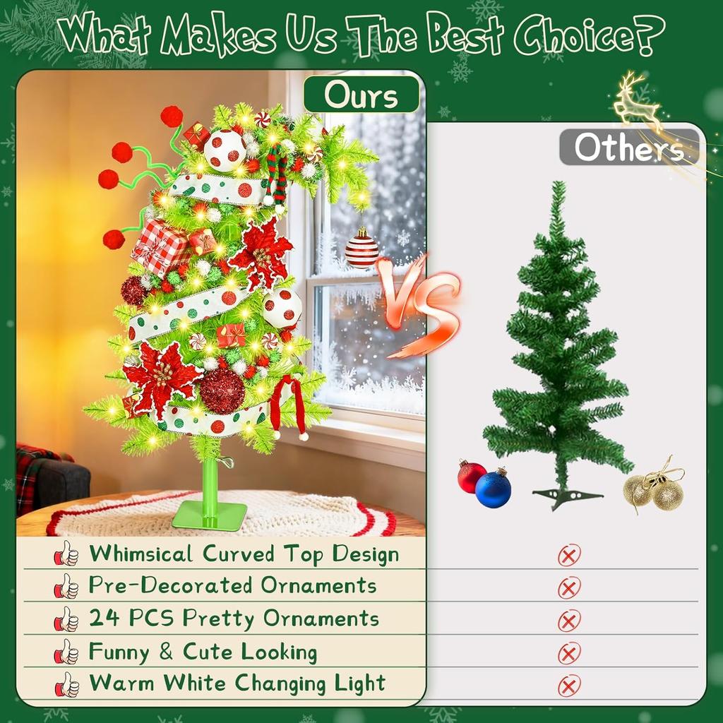 2FT Pre-Decorated Mini Christmas Tree with Lights, Bendable Artificial Tree with Metal Base & Ornaments in Lime Green