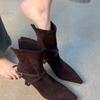 Mode Hoher Absatz Reißverschluss hinten Damen Scrub Gürtelschnalle Spitzzehe Temperament Stiefeletten Vintage Slim Follower Einzelstiefel