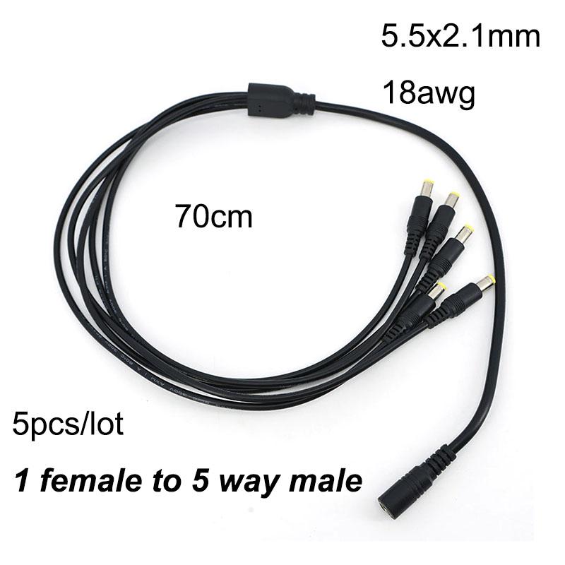 5pcs 70cm long 1 female to 5 way Splitter male extend Cable 5.5*2.1mm to male 18awg branch 22awg 12V DC Power Supply Adapter
