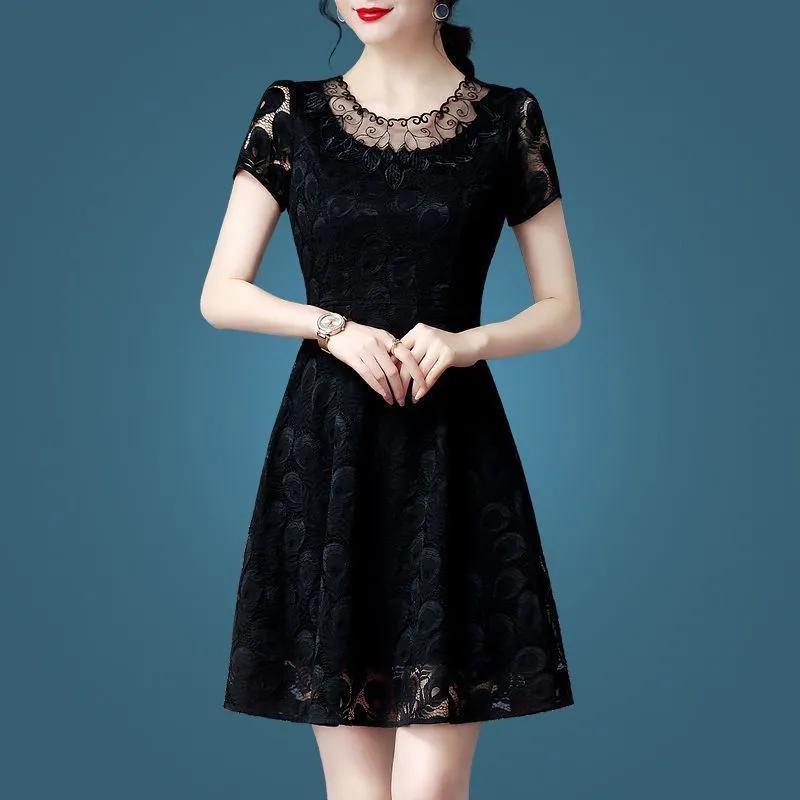 Women's Summer Short Sleeve O-Neck Elegant A-Line Dresses Solid Color Lace Hollow Out Mini Dress
