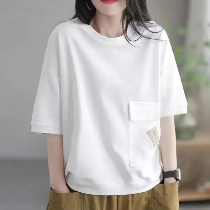Women's Summer Round Neck Short Sleeve Solid Color Pocket T-Shirt Loose Age Reducing Skinny Belly Shading Tops
