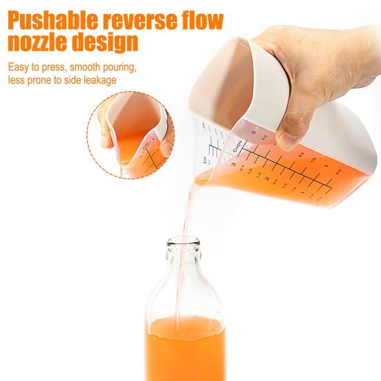 Kontrollierter Ausgießer: Durch Zusammendrücken der weichen Silikonvorderseite entsteht auf natürliche Weise ein fokussierter Ausguss, der ein sauberes Ausgießen von Flüssigkeiten, geschmolzener Butter, Ölen, Teig, Schokolade, Saucen und sogar Harz oder Seife ohne Tropfen oder Verschüttungen ermöglicht.