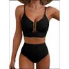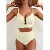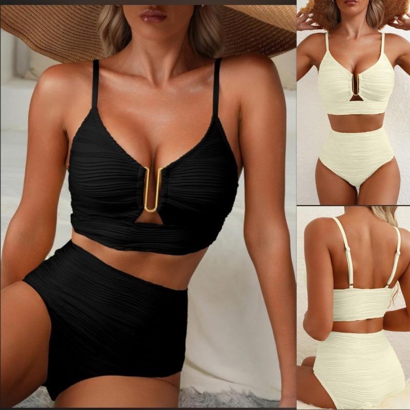 Europäischer und Amerikanischer Einfarbiger Bikini V-Ausschnitt Ausgehöhlt Hohe Taille Badeanzug Textur Plissiert Schmuck Badeanzug Bikini Damen