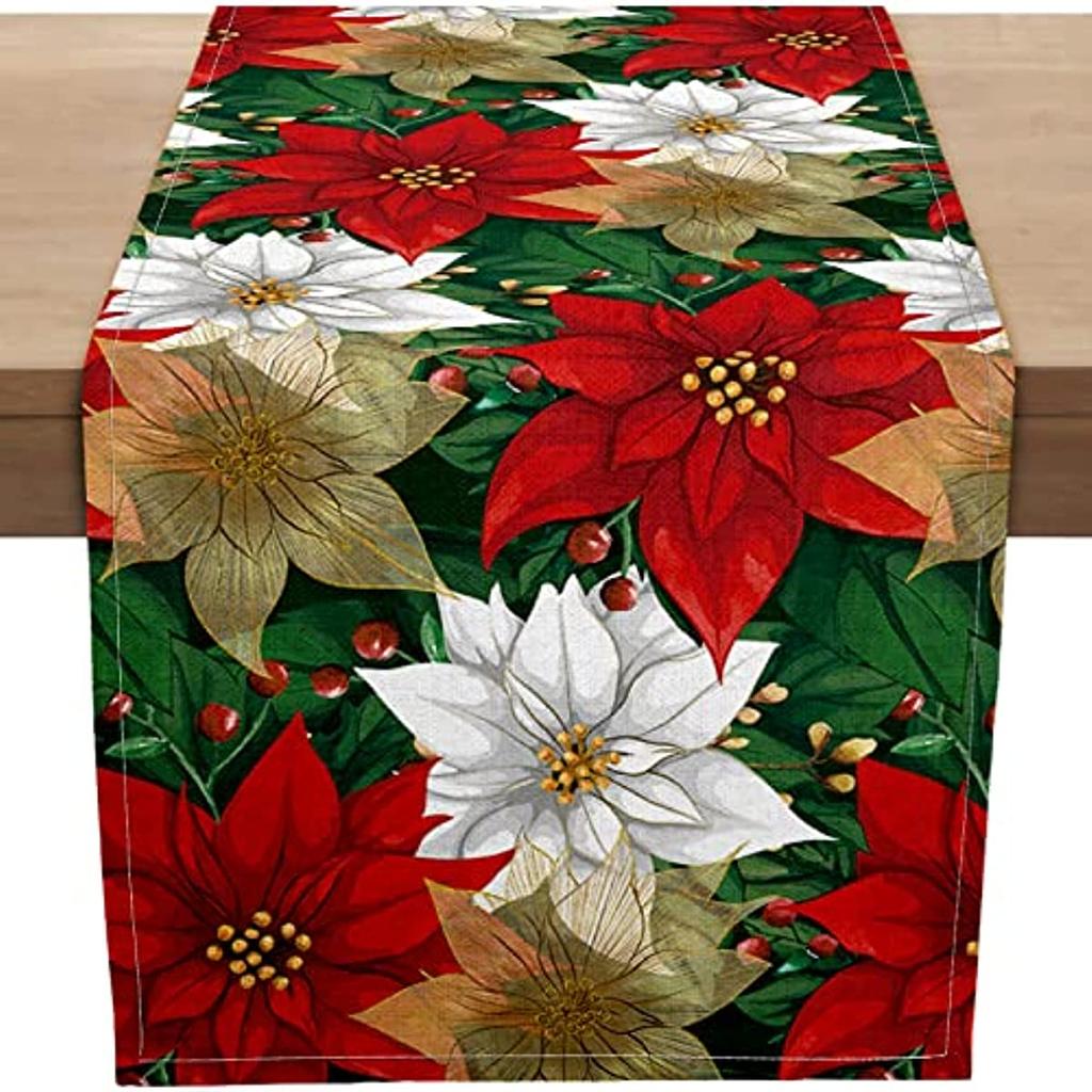 Weihnachts-Poinsettia Tischläufer Leinen Künstliche Küchen-Esszimmer-Dekoration Für Innen- und Außenbereich Zuhause Hochzeitsparty